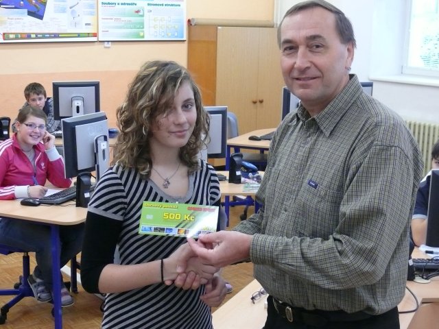 První cena soutěže byla předána osobně ředitelem školy Mgr. Milanem Šťovíčkem vítězi Petru Hamříkovi ze třídy 9.B na 11. ZŠ v Mostě.